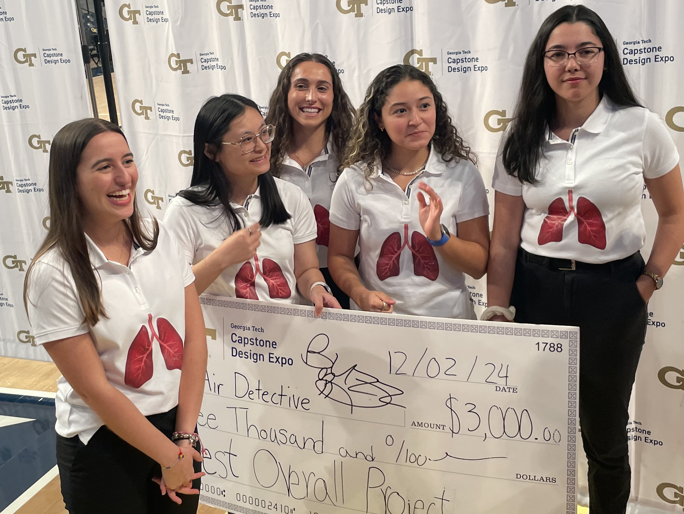 Down on the basketball court, a team of biomedical engineering students called the Air Detectives was celebrating after winning the top prize in the Fall 2024 Georgia Tech Capstone Design Expo. It was the third straight time a Coulter BME team won the overall project competition — BME teams won a share of both top prizes in the last academic year, in the Fall 2023 and Spring 2024 Expos.