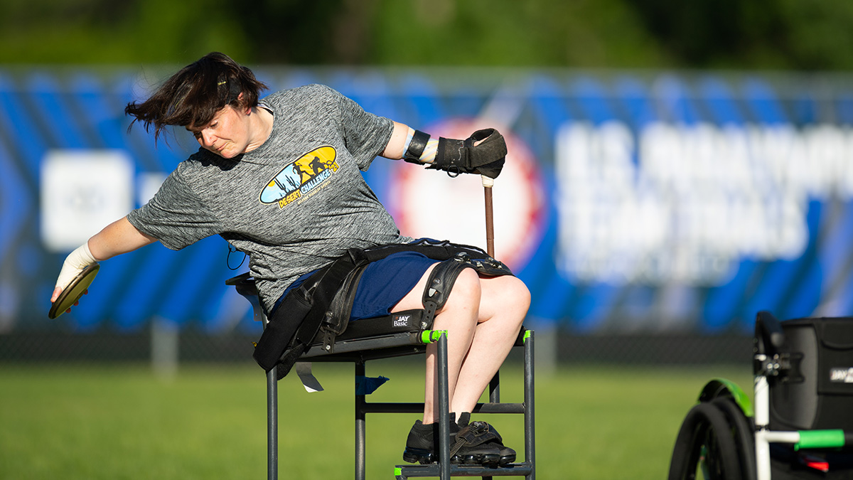 Cassie Mitchell competes in the discus throw at the U.S. Paralympic Trials in June. The biomedical engineering assistant professor is headed to her third Paralympic Games this year, where she hopes to complete her medal set with a long-sought-after gold in discus or club throw. (Photo Courtesy: Mark Reis/U.S. Paralympics Track & Field)
