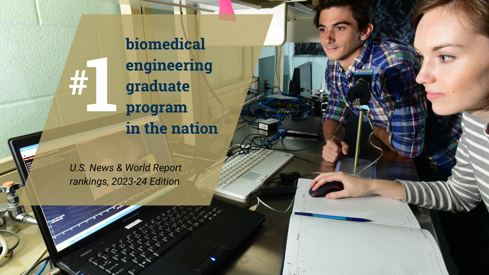 Graphic of one female student and one male student looking at a computer in a lab. A text box on top of the image says number 1 biomedical engineering graduate program in the nation