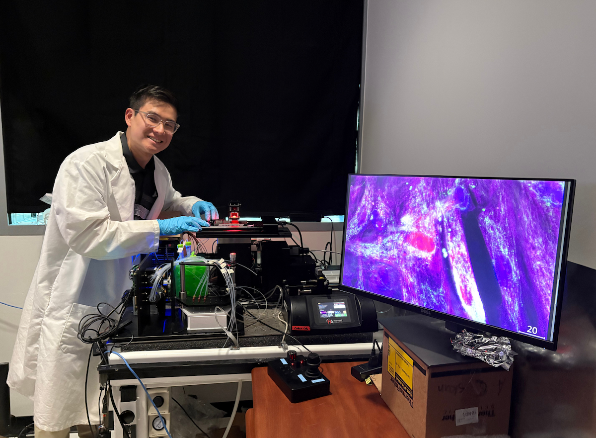 A person wearing a white lab coat and blue gloves is working at a laboratory station equipped with advanced imaging equipment. The setup includes multiple tubes, wires, and containers connected to a black optical device. A large monitor on the right displays a vivid, high-resolution microscopic image in shades of purple and pink, showing tissue structures.