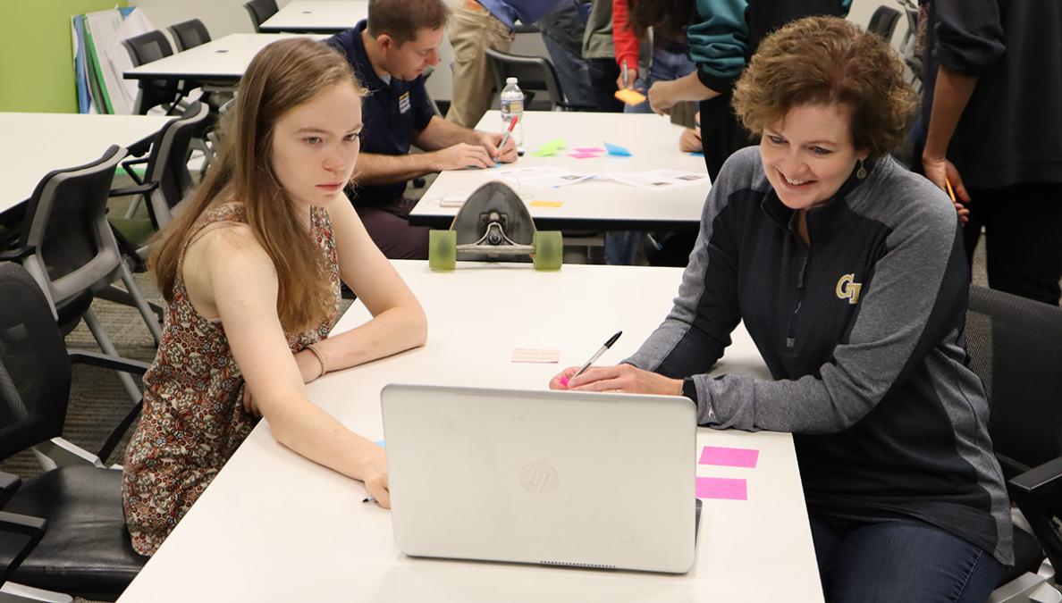Cristi Bell-Huff, right, works with a student during class. Bell-Huff wants to understand how engineering educators can foster empathy in their students and is taking the first steps through a National Science Foundation-sponsored research project examining learning activities in five core classes in the Coulter Department. (Photo: Walter Rich)
