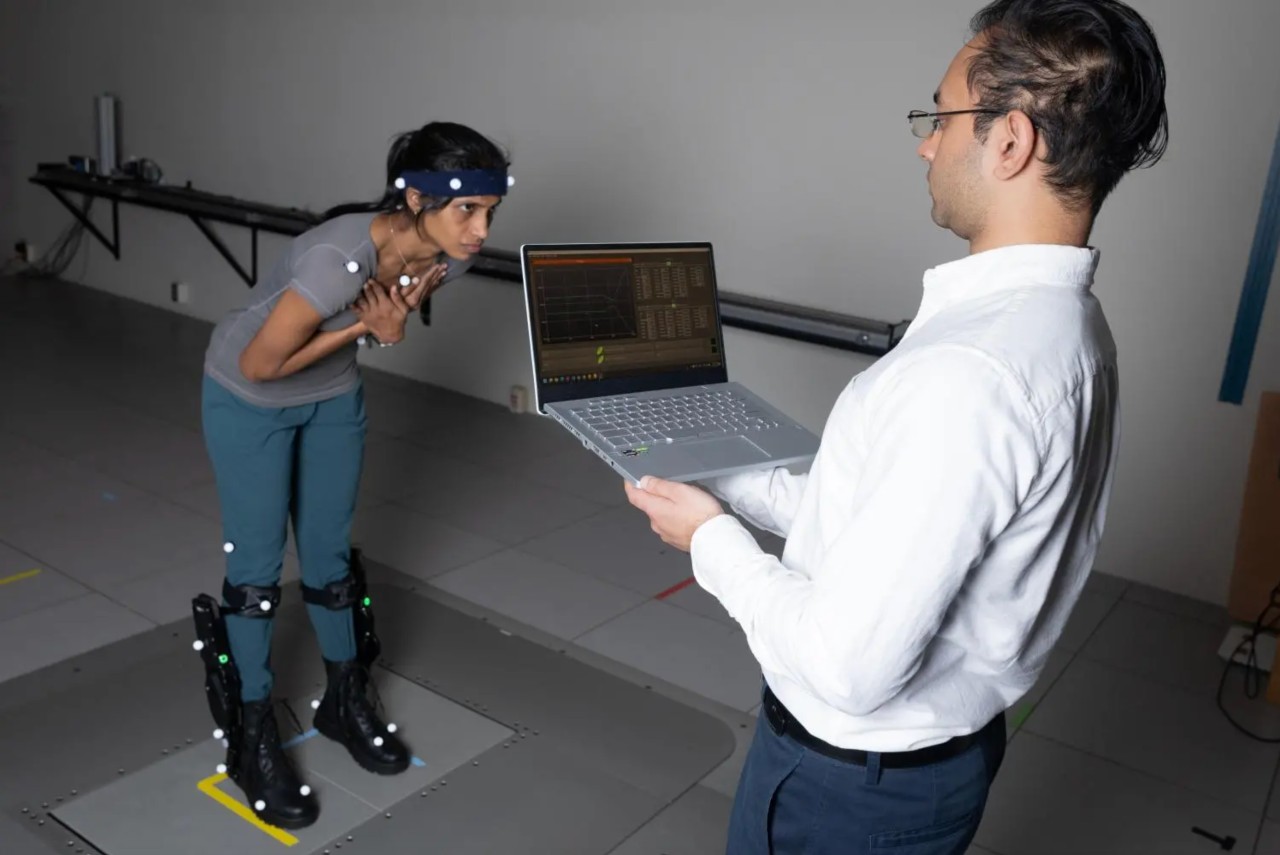 Postdoctoral fellow Surabhi Simha demonstrates how researchers tested whether robotic ankle exoskeleton boots can help people with their balance when its disrupted. Subjects wore sensors for motion capture, muscle activity, and ultrasound while they stood on a platform that shifts abruptly to disrupt their balance. Research engineer Rish Rastogi, right, monitors some of the data being collected.